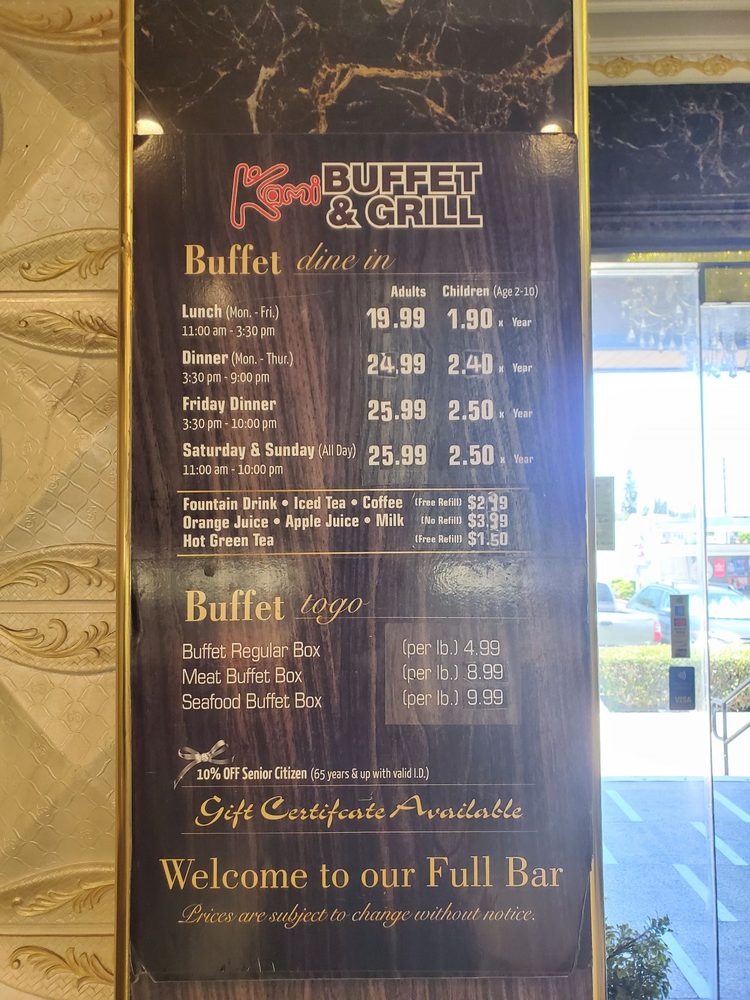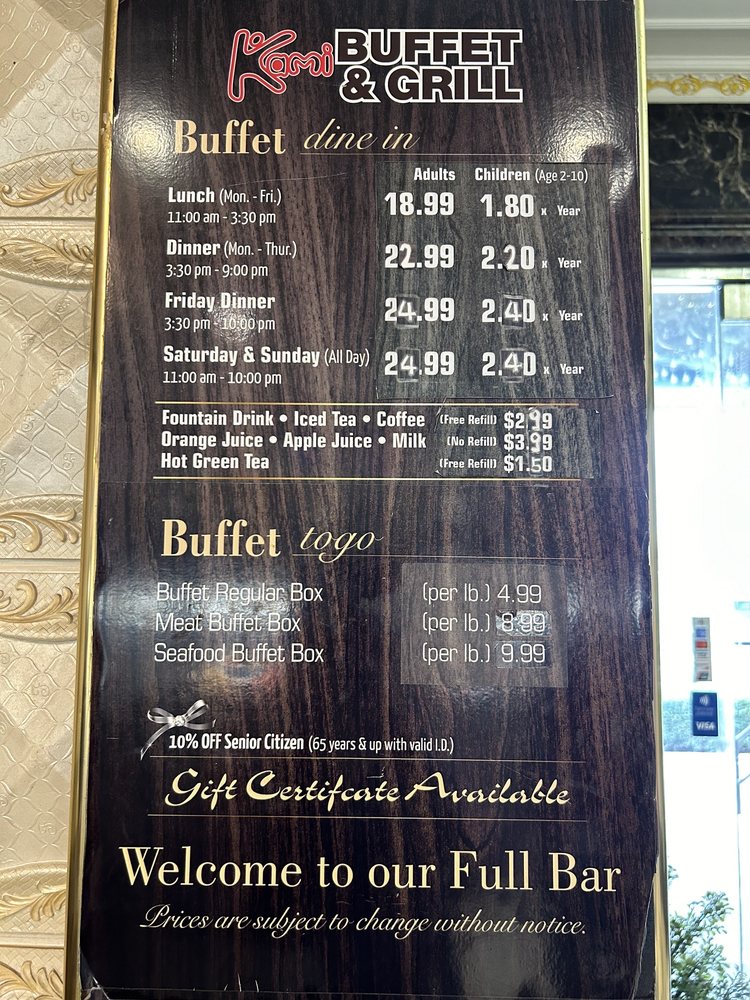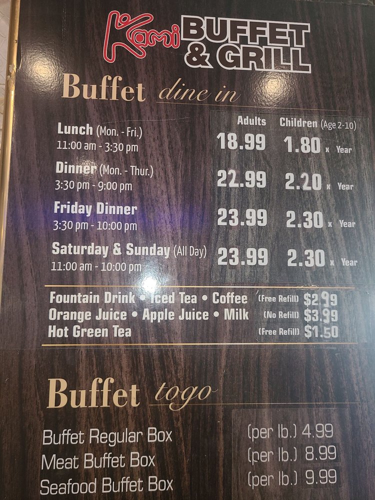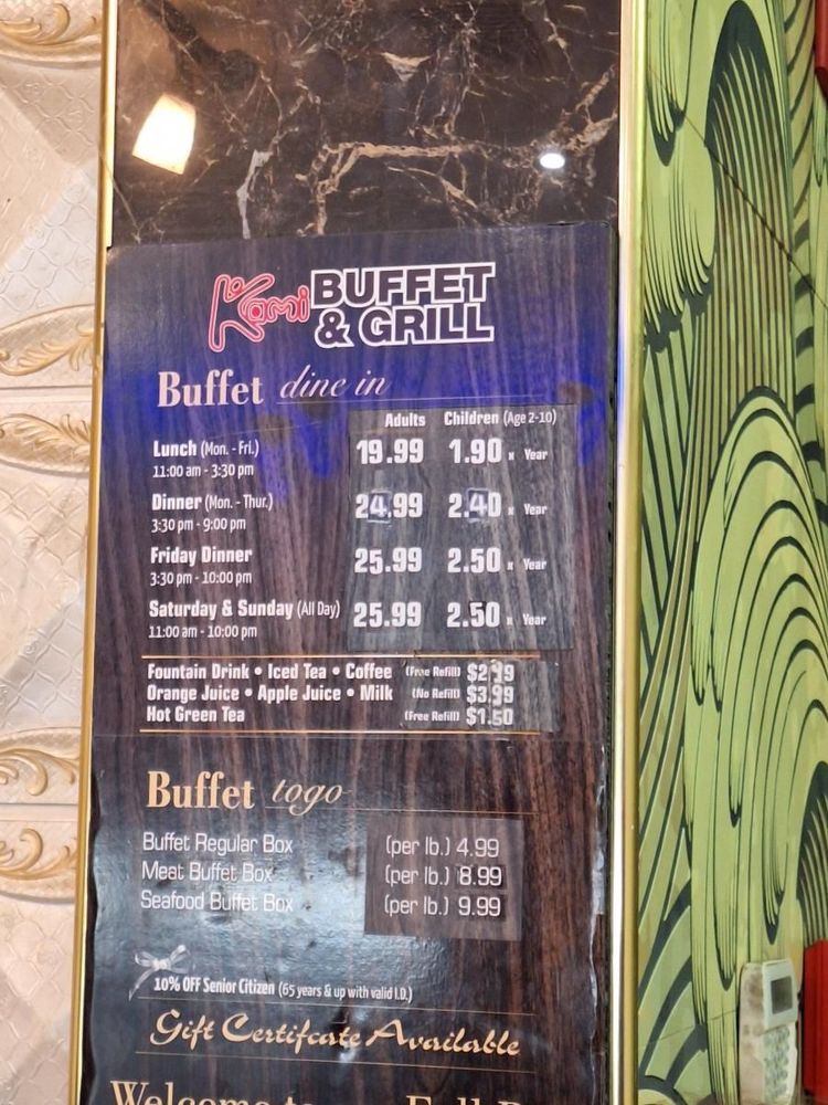 Introducing the menu at Kami Buffet & Grill, a buffet and grill restaurant located in Rosemead, CA, offering Chinese and sushi bar options. With a focus on crab legs, this bustling eatery is known for its quick food turnover and generous portions. Customers like Kyung Jae S. praise the abundance of crab legs stacked high on ice, making it a popular choice for families. For a diverse dining experience, patrons can enjoy a variety of dishes including sushi, hot foods, and Mongolian BBQ. Despite some mixed reviews, many are pleasantly surprised by the wide selection and quality of the food. Whether you're looking for a casual brunch, lunch, or dinner spot, Kami Buffet & Grill provides ample seating, parking, and a range of dining options for any occasion.